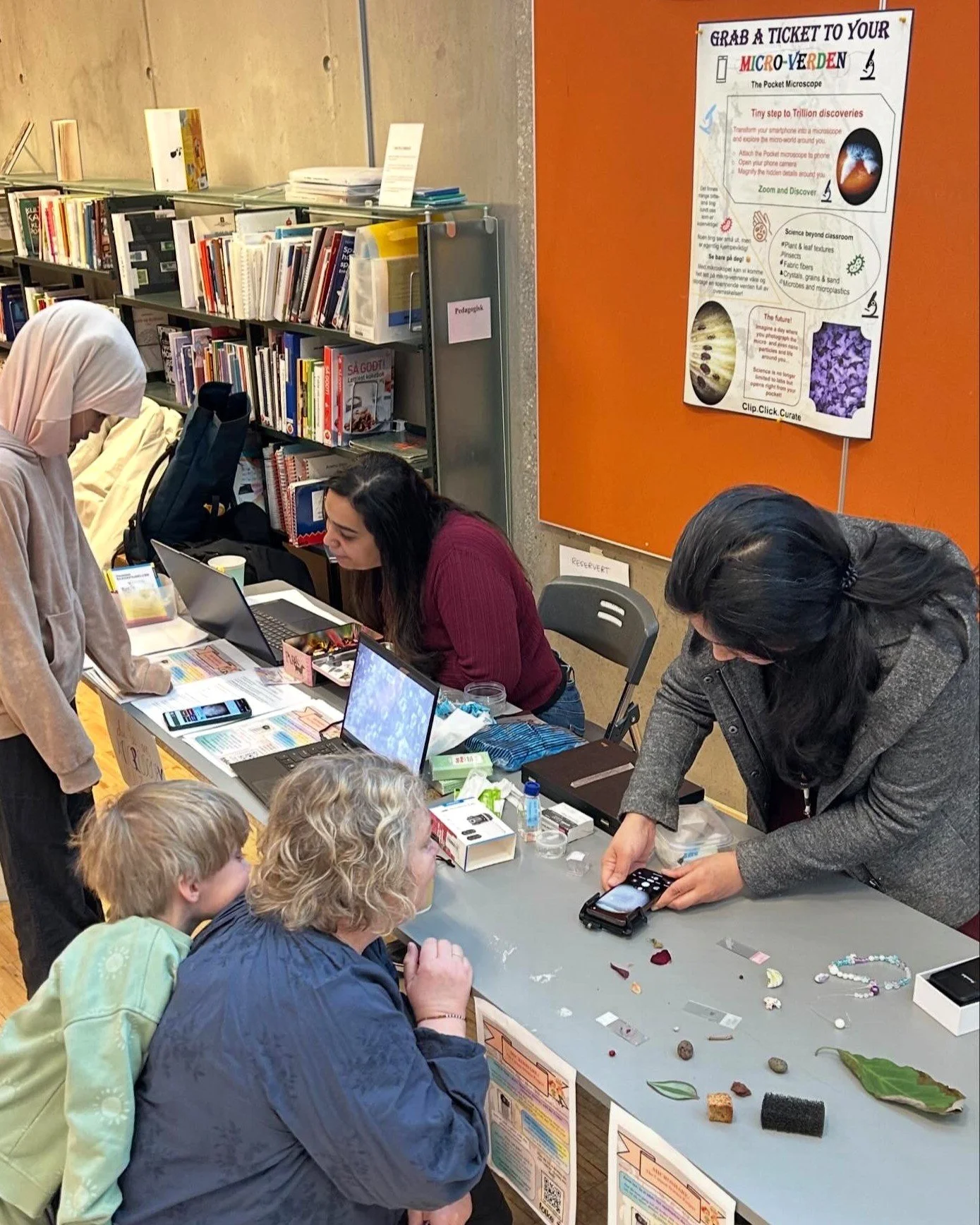 Ved stasjonen “Pocket microscopy” kunne besøkende studere hverdagslige objekter gjennom et mobilmikroskop. Aktiviteten er første steg i et nytt prosjekt, som Abhinanda Ranjit Punnakkal utvikler sammen med Melcy Philip og Nikil Jayakumar.